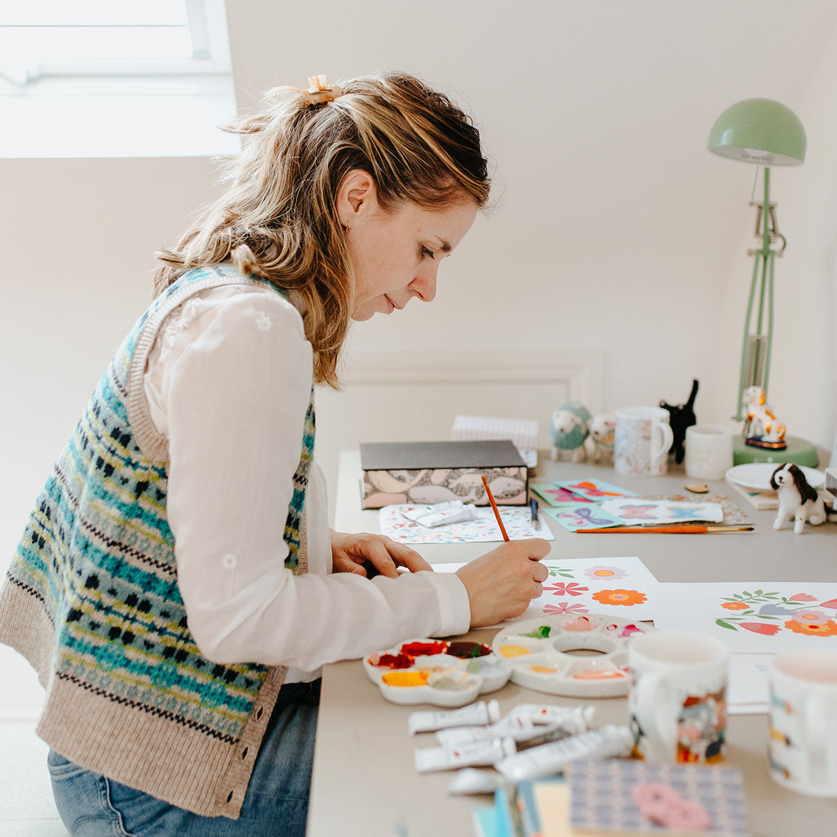 With a background in illustration, Mary uses pattern, colour and humour to create her popular animal based designs which are then brought to life on ceramics, textiles and stationery. Her most popular characters are Baatholomew the sheep, who knits his own jumpers, and Larry the Long Dog who enjoys dressing up!